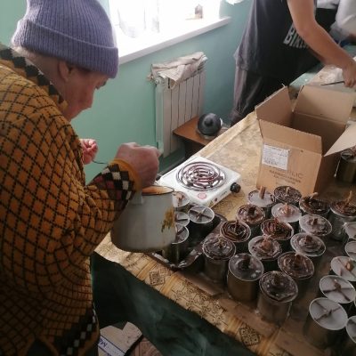 Дети вырезали из картона внутренние части свечей и закрепляли внутри баночек. Взрослые занимались растопкой и заливкой парафина в банки. Через несколько минут остывания парафина свеча готова. Окопные свечи горят от 6 до 9 часов, нагревают воздух в помещении или блиндаже, помогают бойцам высушить вещи и приготовить горячую пищу.