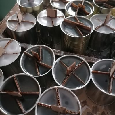 Материалами для изготовления послужили гофрированный картон от коробок, консервные банки и парафин. Банки благотворительно предоставил Троицкий консервный цех, коробки нашли своими силами, парафин закупили в интернете на средства храма.