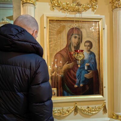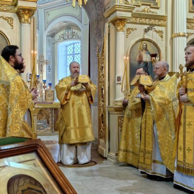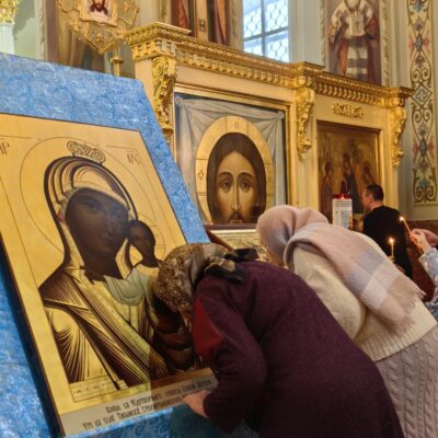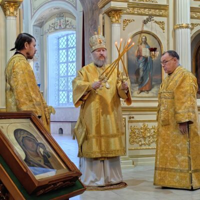 По заамвонной молитве духовенство во главе с архипастырем совершили славление Пресвятой Богородице перед Её иконой «Табынская» и совместно со всеми молящимися в храме пропели молитву «Царице моя Преблагая…»