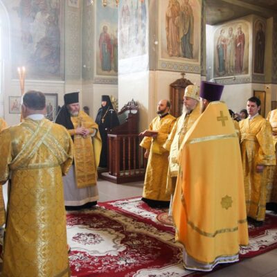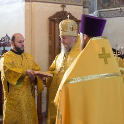 Правящему архиерею сослужили: исполняющий обязанности наместника Свято-Николаевского мужского монастыря близ села Кадымцево иеромонах Павел (Перунков) и настоятель храма св. вмч. Екатерины г. Троицка иерей Кирилл Кривоногов.