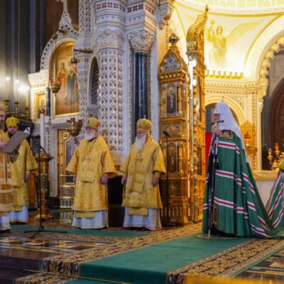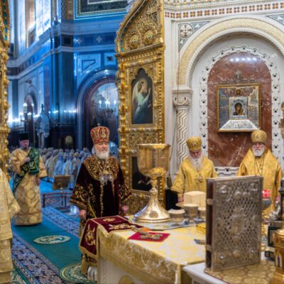В этот знаменательный день Святейший Патриарх Кирилл совершил Божественную литургию в кафедральном соборном Храме Христа Спасителя в Москве в интронизационных облачениях и с копией жезла святителя Петра. Его Святейшеству сослужил сонм архиереев Русской Православной Церкви.