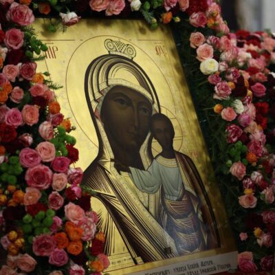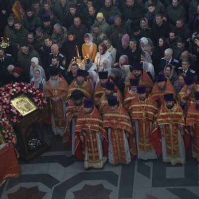 Божественная литургия завершилась славлением Пресвятой Богородицы и Собора новомучеников и исповедников Церкви Русской перед принесенным сегодня в град святой Екатерины дореволюционным списком Табынской иконы.