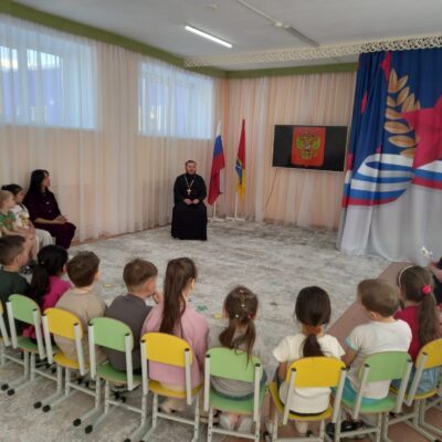 В преддверие Дня Защитника Отечества в детском саду №19 прошли «Разговоры о важном». Настоятель храма Покрова Пресвятой Богородицы города Южноуральска, руководитель епархиального миссионерского отдела иерей Вадим Бойко рассказал детям о Героях России, включая героя нашего времени Евгения Родионова.
