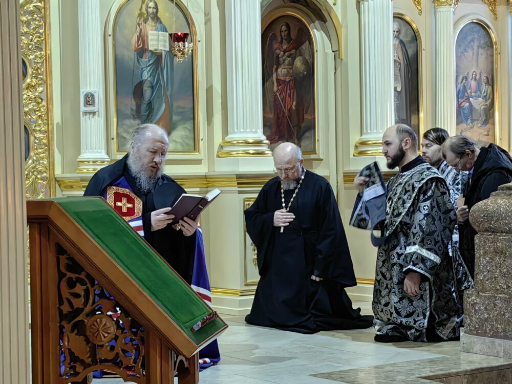 После пения великого прокимна духовенство сменило облачения на великопостные черные, в храме зазвучали особые постовые песнопения. Владыка Павел прочитал коленопреклоненные молитвы на начало Святой Четыредесятницы после чего обратился к пастве: